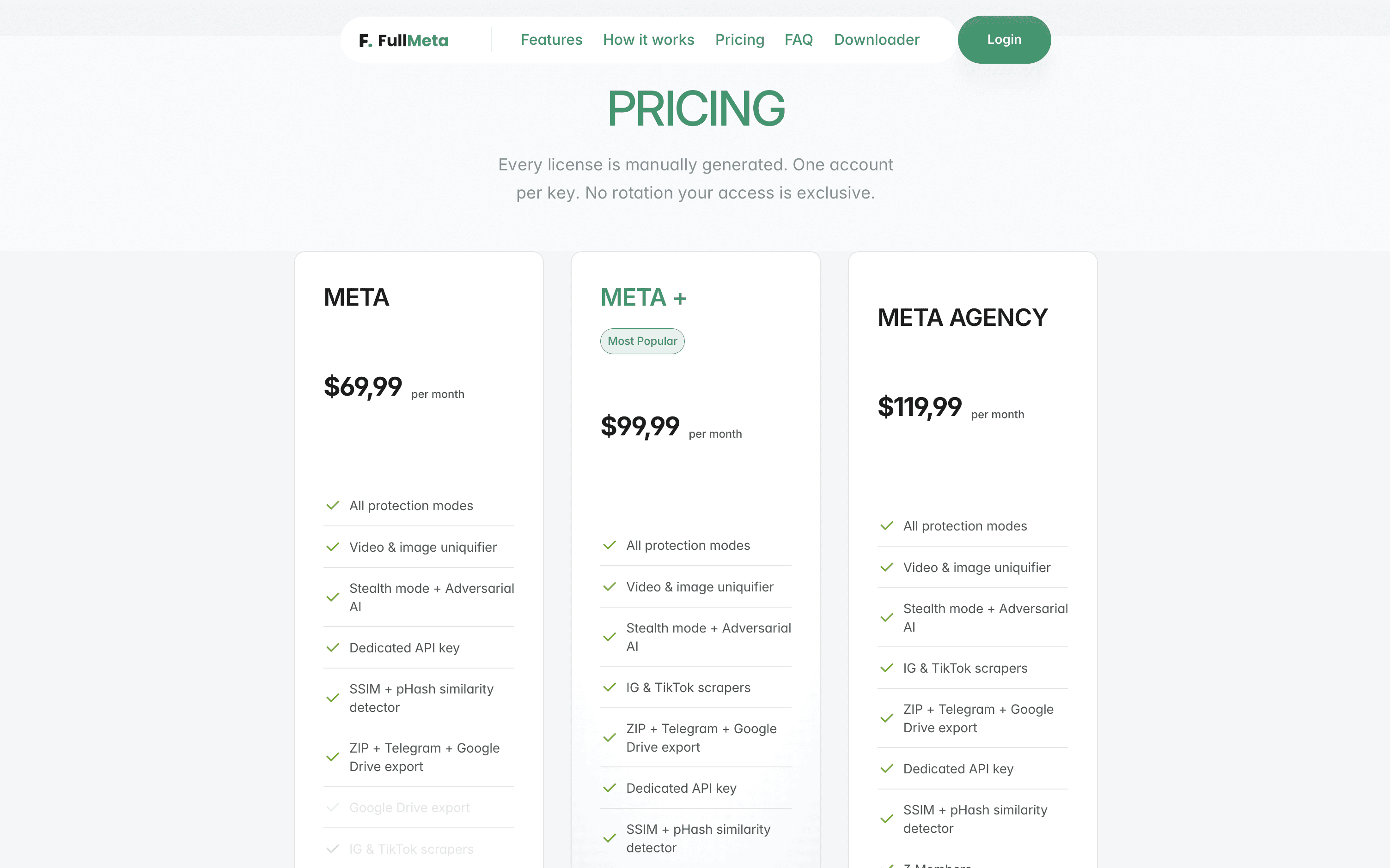 All three plans share the same core features — the differentiation lives in volume and agency-scale usage. The "Most Popular" badge naturally steers visitors toward the middle-tier plan.