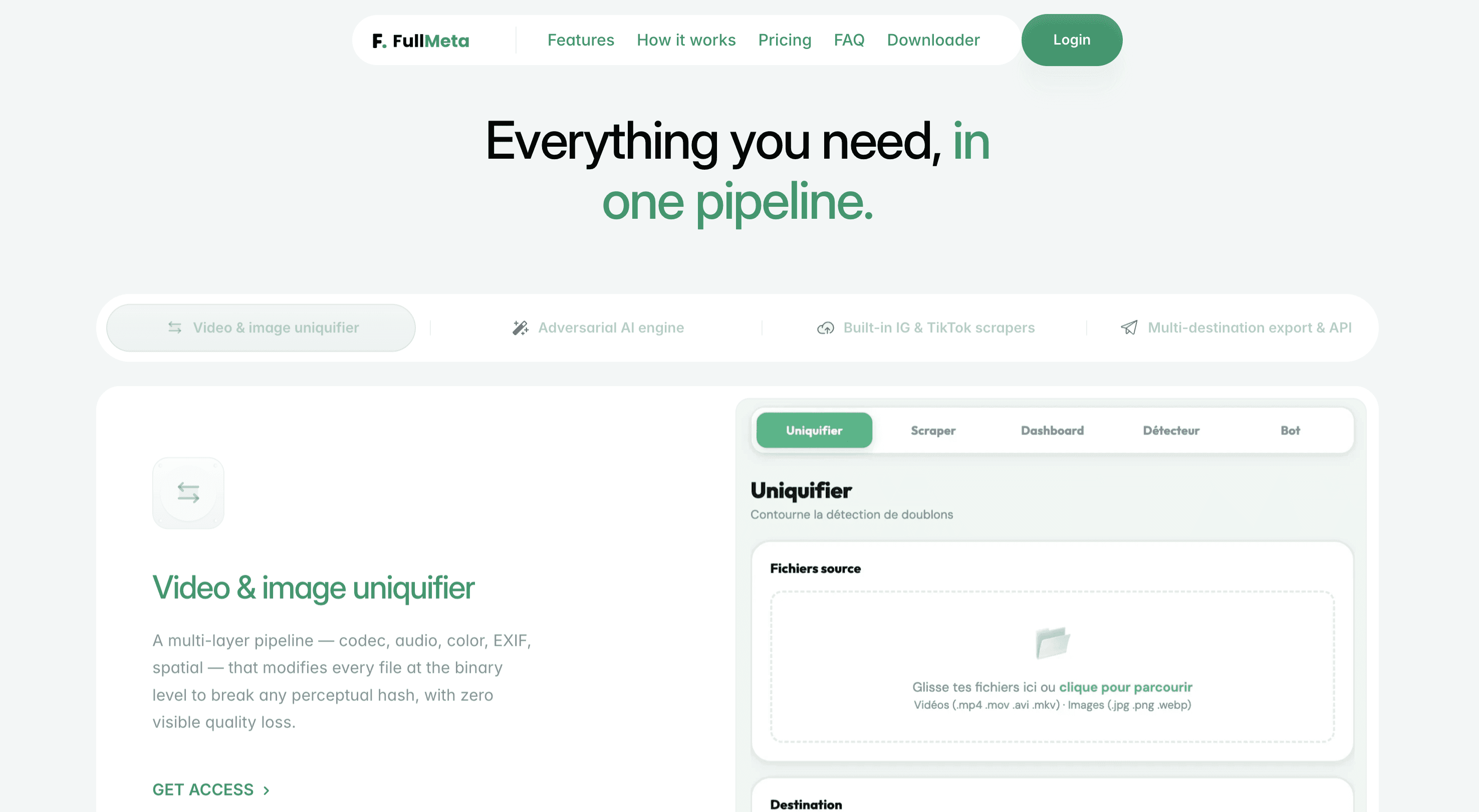 Video & image uniquifier → "A multi-layer pipeline — codec, audio, color, EXIF, spatial — that modifies every file at the binary level to break any perceptual hash, with zero visible quality loss."